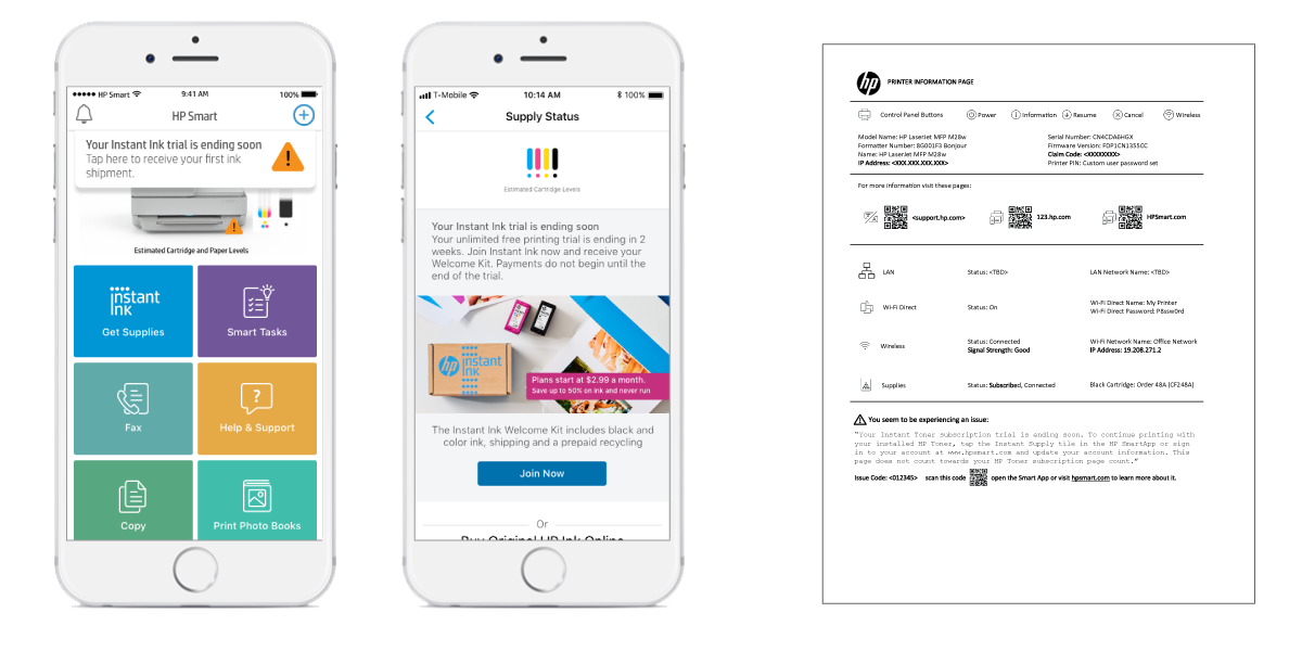 Educating customers about the service during the trial through various channels, including physical assets, emails, app notifications, dashboard notifications, and printer messaging